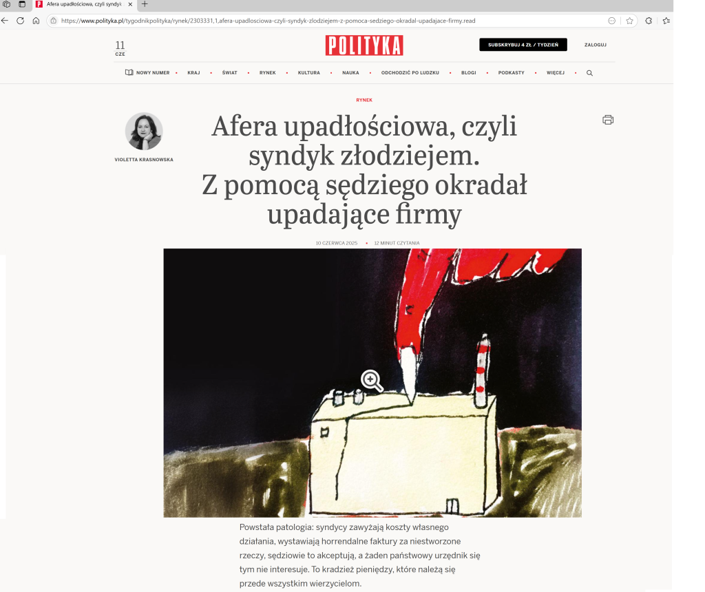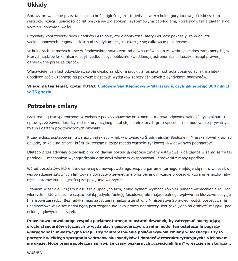 Opisane w poniższym artykule Onet-u przedłużanie postępowań upadłościowych i patologiczne mechanizmy zarządzania majątkiem firm w upadłości, nazwane przez prof. Ewę Łętowską, żerowaniem, z korzyścią dla syndyków i osób z nimi współpracujących, również byłych sędziów sądu gospodarczego, od wielu lat są dobrze znane organom władzy i organom ścigania. Niestety, jak widać nikomu nie zależy na zmianie przepisów prawa, tak aby je uszczelnić i uniemożliwić generowanie patologii. W czyim to jest interesie? Czy chodzi o interes wierzycieli i o ratowanie dłużników? Czy należy się jedynie dziwić na brak reakcji Prokuratury?