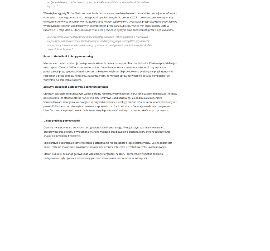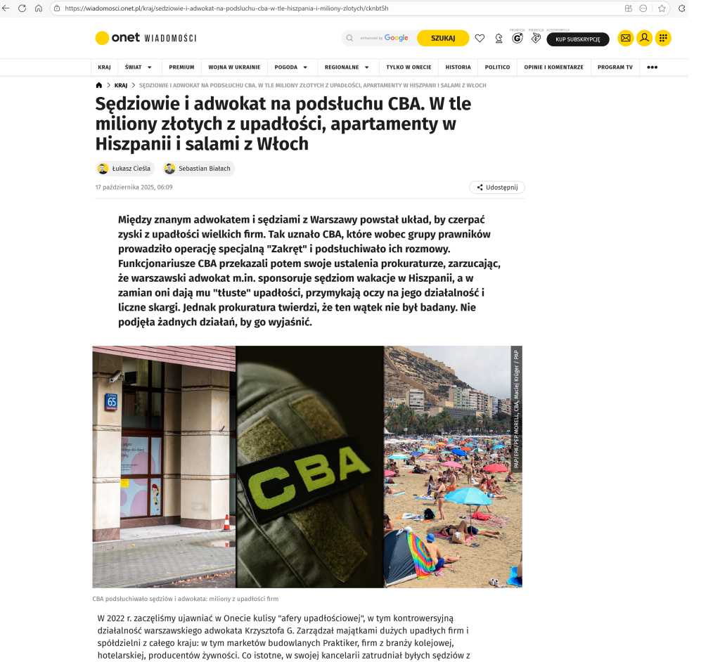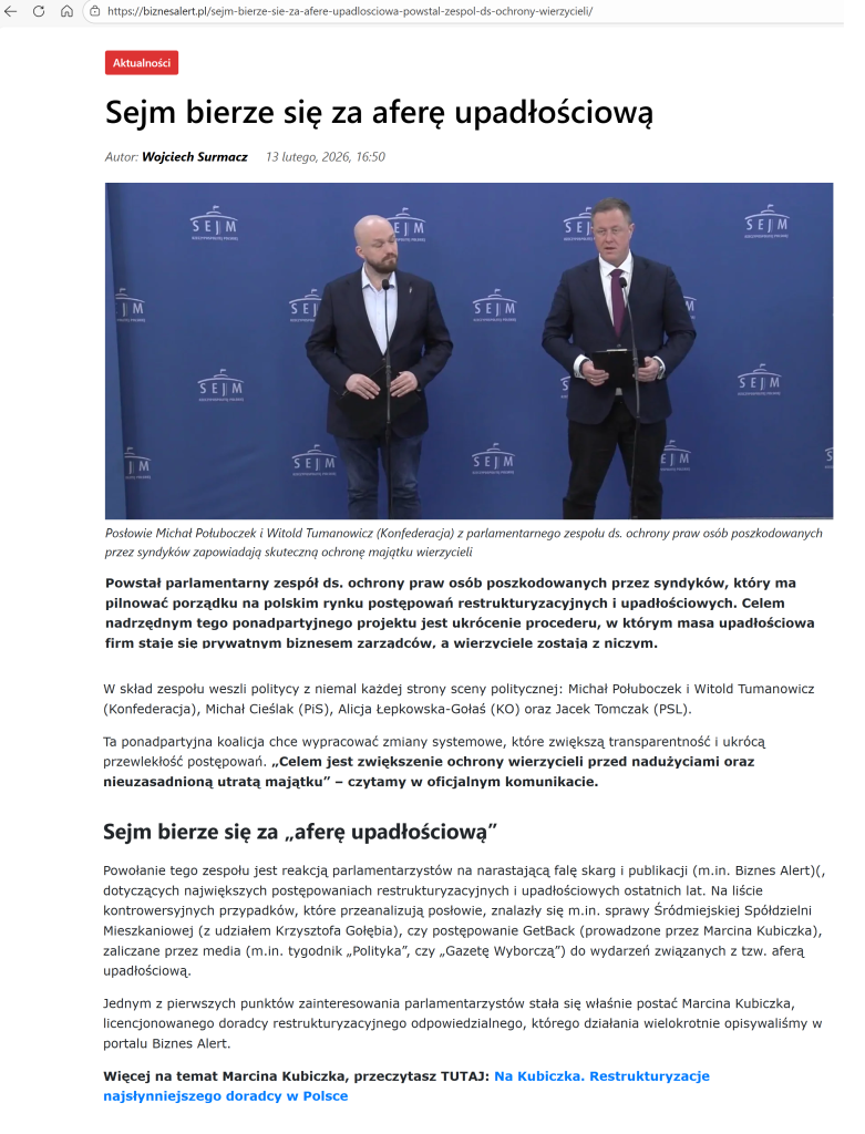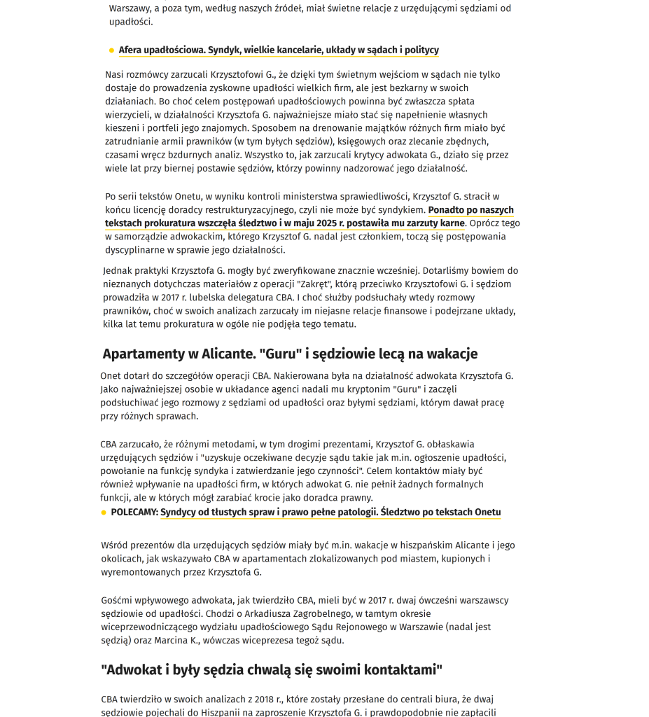 „Dziennikarze Onetu Andrzej Gajcy i Łukasz Cieśla ujawnili aferę upadłościową i działalność syndyka Krzysztofa Gołąba, który od lat doprowadza do rozpaczy kolejne firmy. Na naszą publikację zareagowało Ministerstwo Sprawiedliwości. Wiceminister Marcin Warchoł zlecił przeprowadzenie wizytacji kancelarii syndyka, a także wysłał do Prokuratury Krajowej wniosek o zbadanie wątków opisanych w naszym artykule. Resort rozważy również wprowadzenie zmian legislacyjnych.