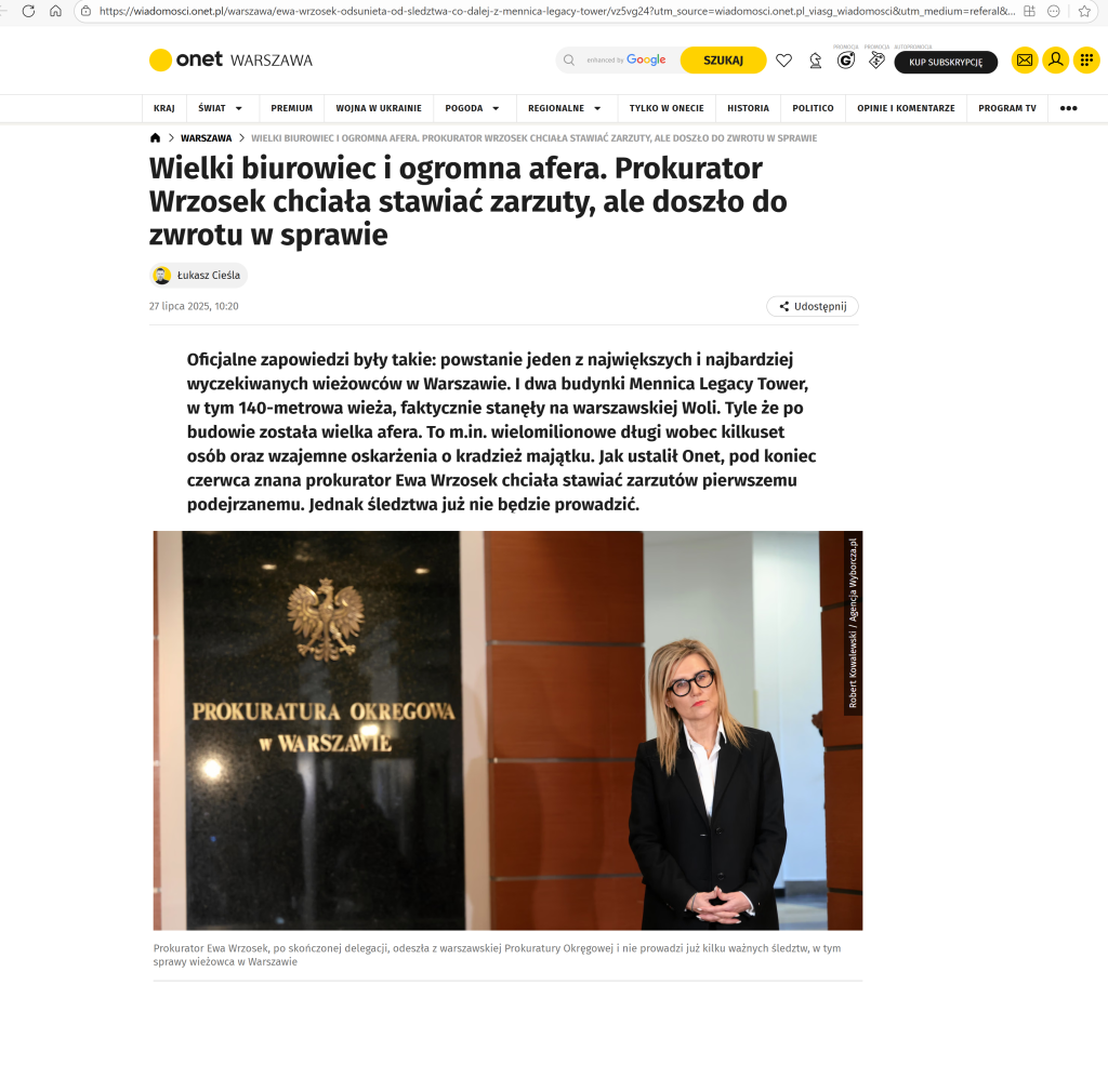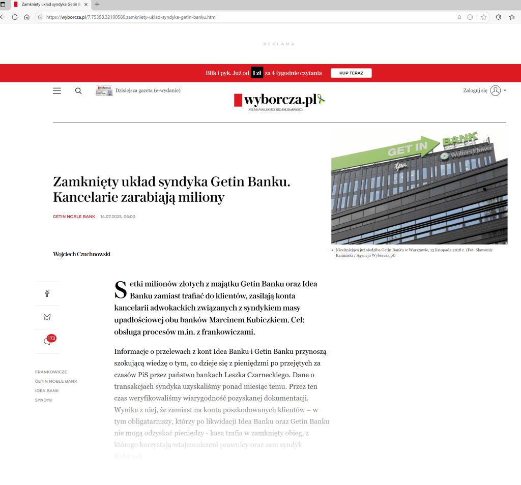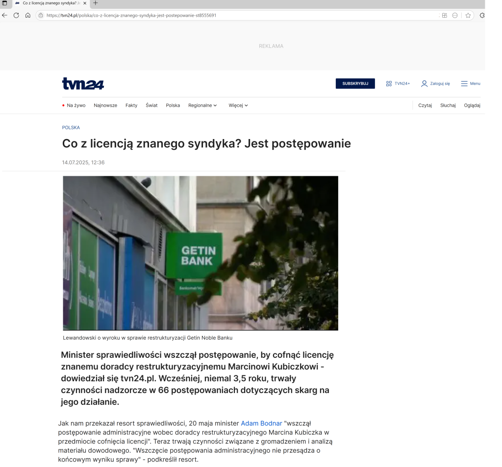 „Dziennikarze Onetu Andrzej Gajcy i Łukasz Cieśla ujawnili aferę upadłościową i działalność syndyka Krzysztofa Gołąba, który od lat doprowadza do rozpaczy kolejne firmy. Na naszą publikację zareagowało Ministerstwo Sprawiedliwości. Wiceminister Marcin Warchoł zlecił przeprowadzenie wizytacji kancelarii syndyka, a także wysłał do Prokuratury Krajowej wniosek o zbadanie wątków opisanych w naszym artykule. Resort rozważy również wprowadzenie zmian legislacyjnych.