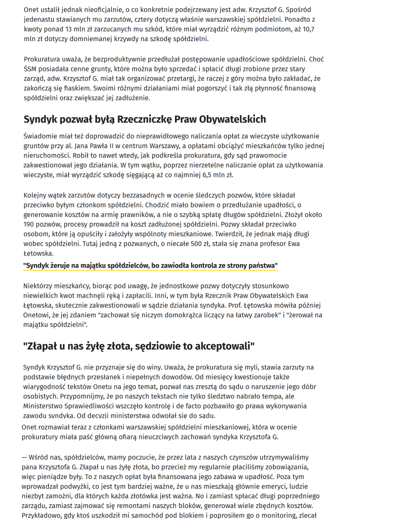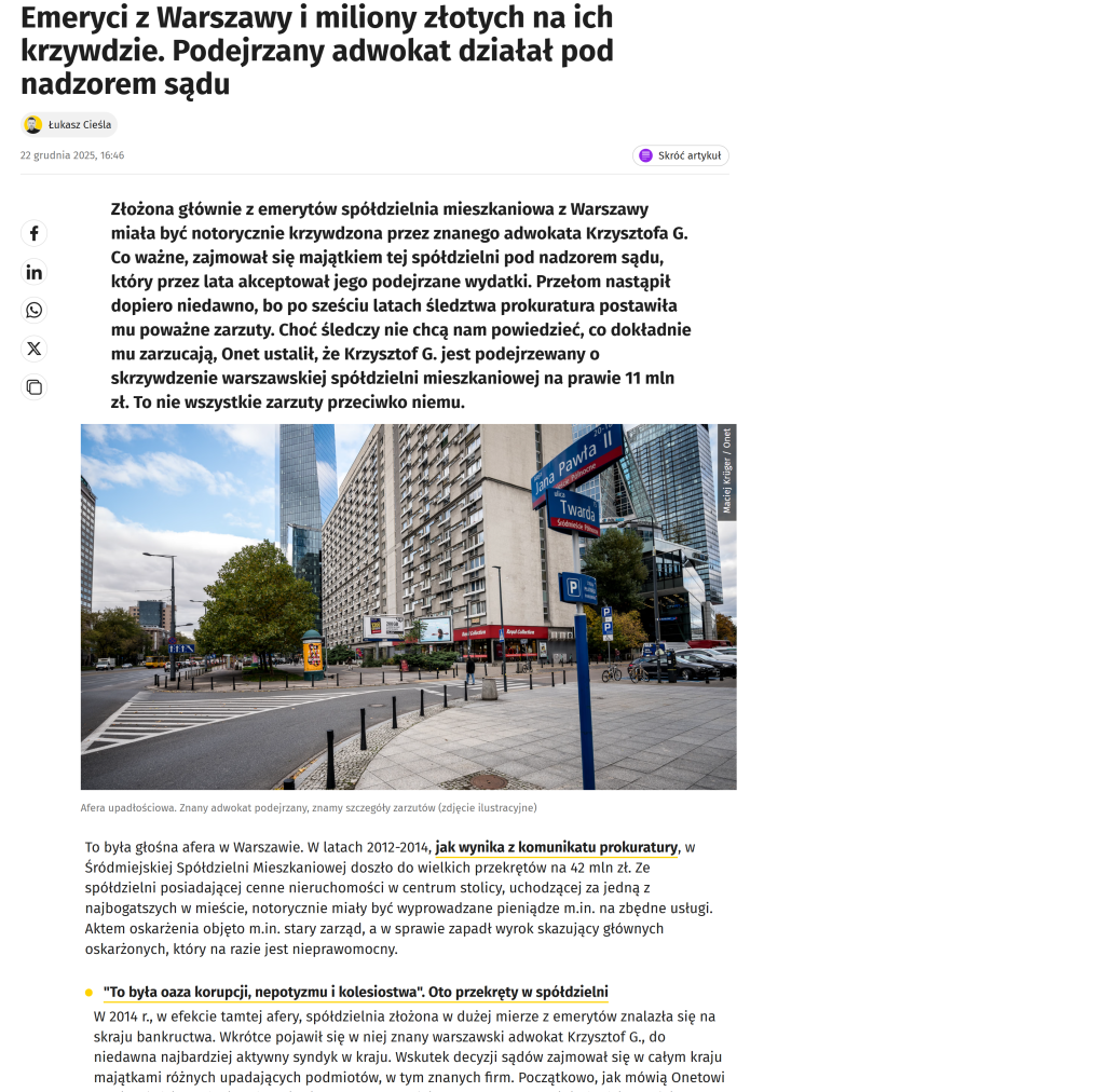 Poniżej linki do artykułów Onetu z dnia 24 października 2022 r. pt. „Afera upadłościowa. Syndyk, wielkie kancelarie, układy w sądach i politycy ” i „ Syndyk Gołąb żeruje na majątku spółdzielców” oraz linki do innych artykułów, związanych z opisaną aferą.